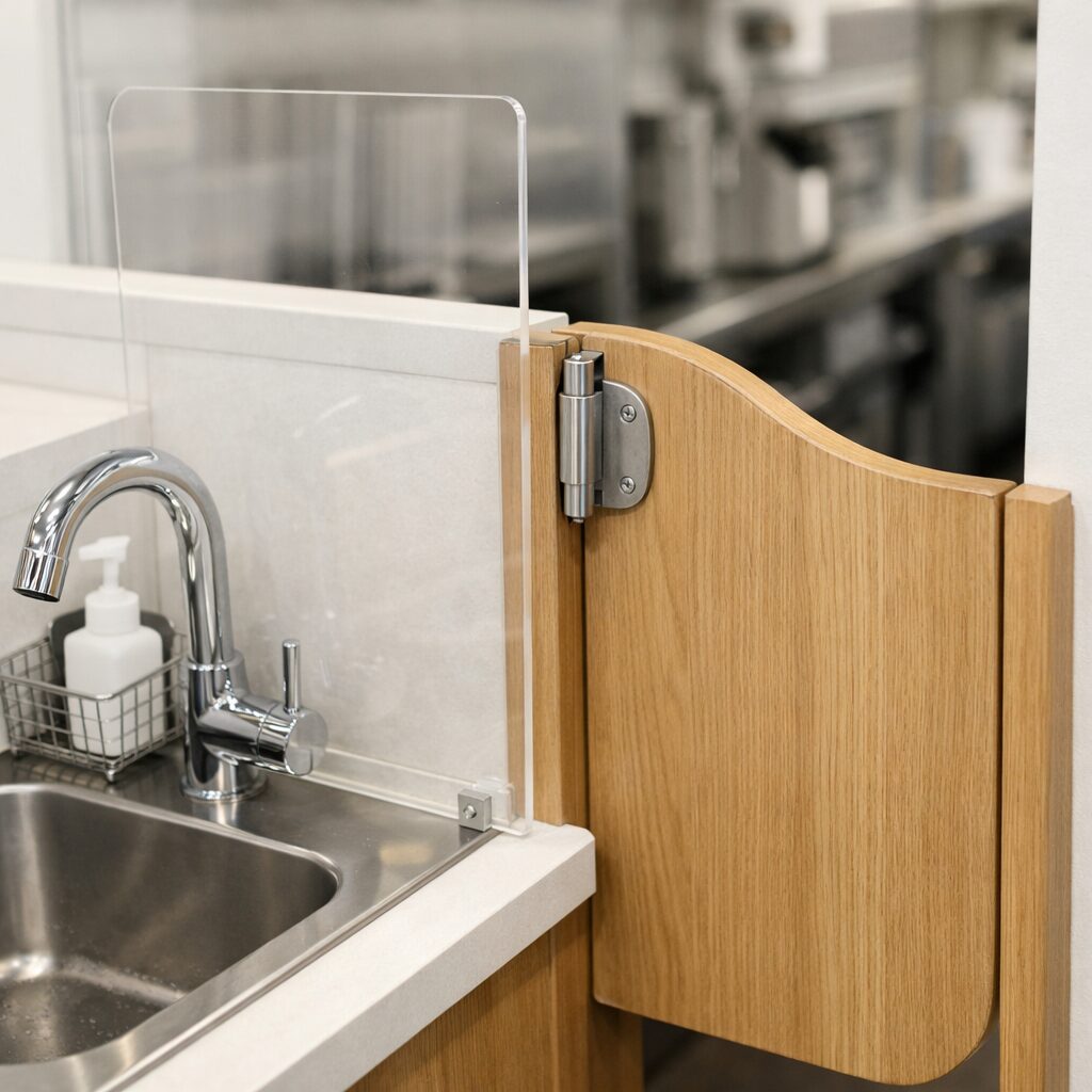 - 基準の目安:自治体によりますが、手洗い場とサーバー(または食品)の間は30cm〜50cm程度離すか、間に「アクリル板などの遮蔽板(高さ30cm以上)」を設置して、水しぶきをガードする必要があります。