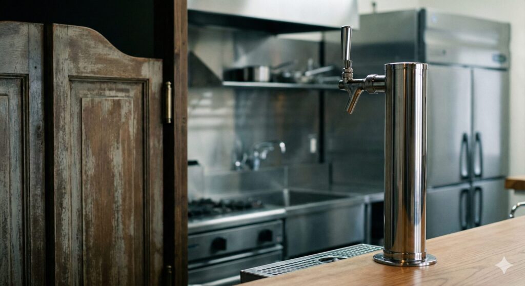 - 対策:注ぎ口はあくまで厨房のライン(カウンターの内側)に収めること。もしデザイン上どうしても客席側に見せたい場合は、客席との間に「ガラスの衝立(ついたて)」を立てて、飛沫(ひまつ)がかからない構造にする必要があります。