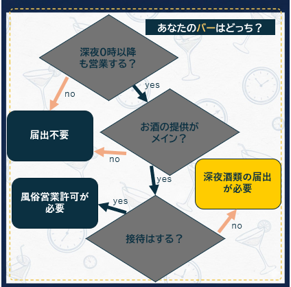• 深夜0時以降、お酒メイン、接待なしのお店が必要な届出