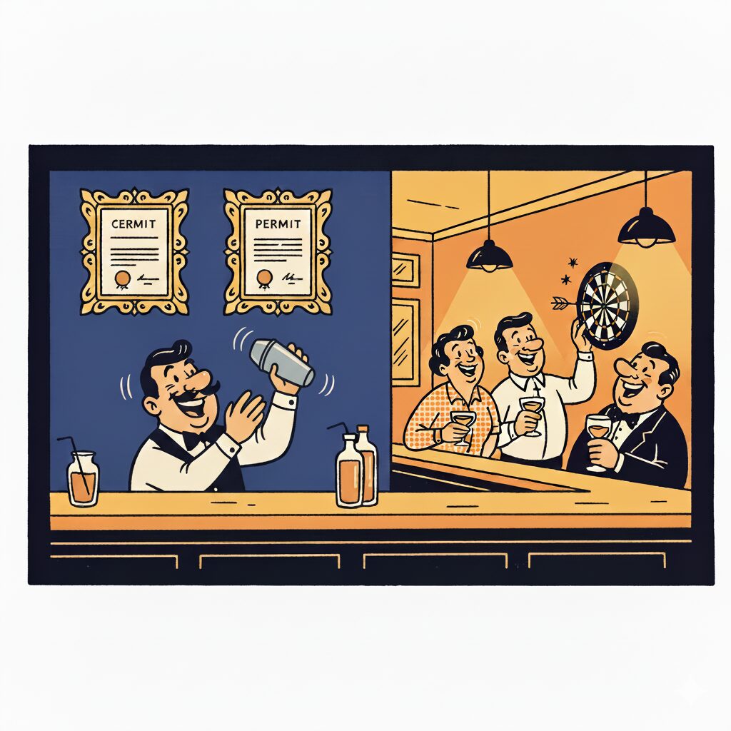 保健所の飲食店営業許可さえ取れば、何をやってもOK!…というわけではないのです。今回は、バー開業を目指す方がハマりやすい、「深夜酒類提供飲食店営業開始届出」(通称:深夜酒類の届出)と「遊技設備」の、非常に難しい関係について解説します。