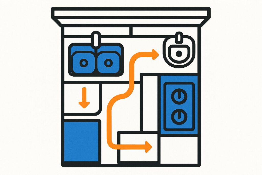 二槽シンクは必須ですが、そのサイズ規定は自治体によって微妙に異なります。横浜市など、都市部では比較的コンパクトなサイズでも認められる場合があります。まずは管轄の保健所に最小サイズを確認し、規定ギリギリのシンクを選ぶことで、貴重なスペースを確保できます。シンク下のスペースも、給排水管を工夫して収納に活用しましょう。